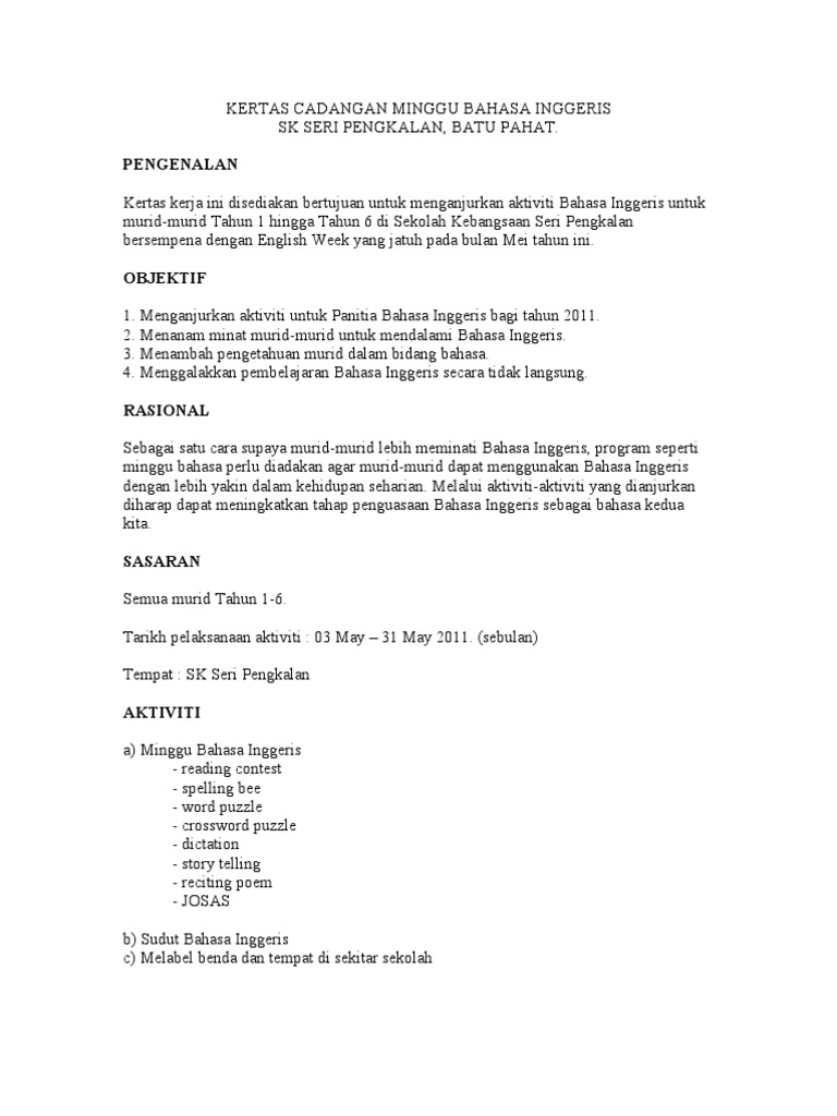 Proposal English Week 2014 - Free download as Word Doc doc PDF File pdf Text File txt or view presentation slides online. Look through examples of kertas kerja translation in sentences listen to pronunciation and learn grammar. English Week program aims to help students engage in.